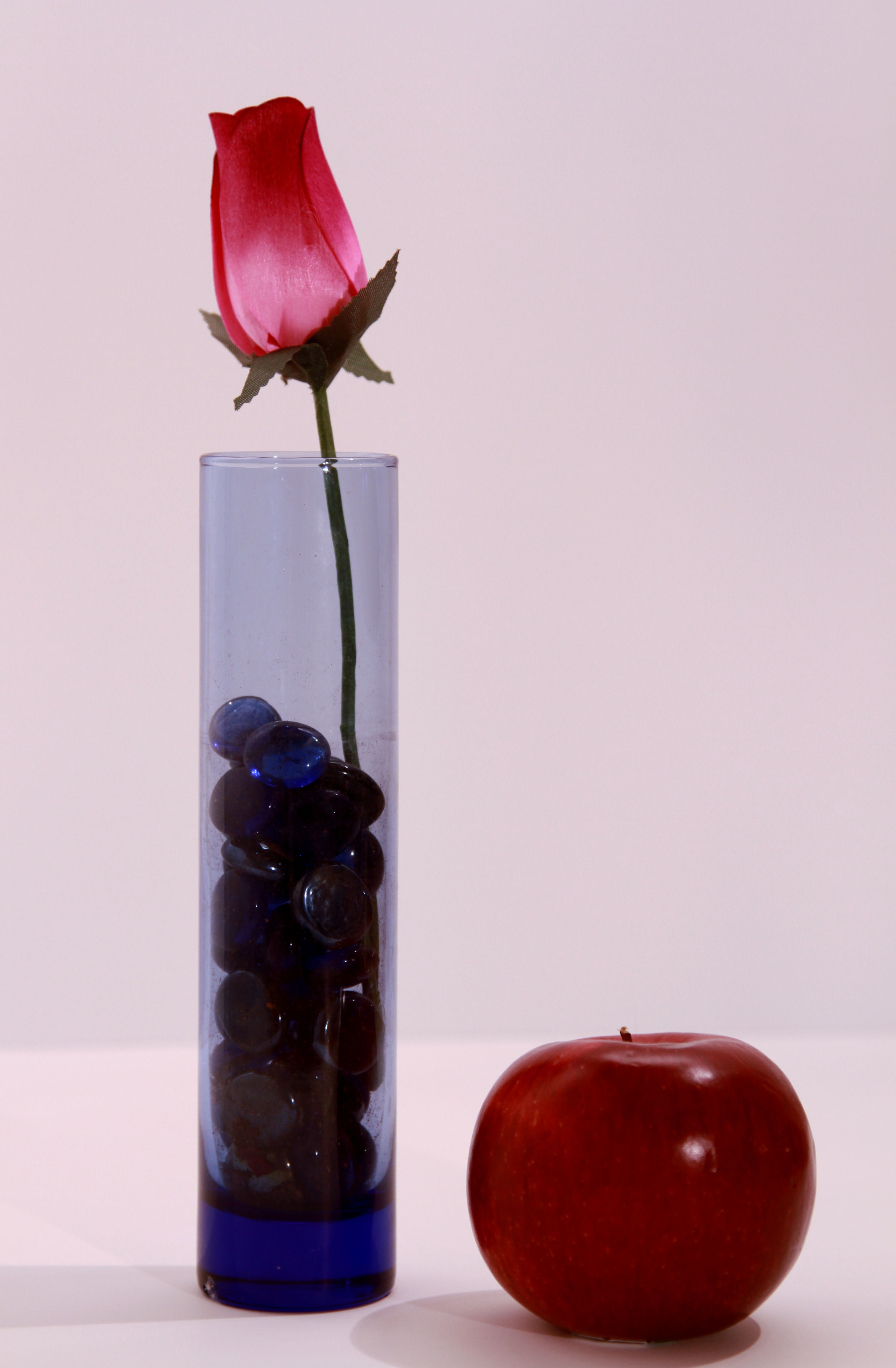 These were shot during my first attempt with constant studio lighting. I used two lights but it looks like a third is needed to eliminate some shadows. And the background may need some fine tuning. The Rose/apple combo I used the 24-105 4.0. 1/5 sec at f4, iso 100. My first thought would be to use a faster lens so on the second shot i used an 85 at 1.8 1/80 iso 100. Looks like I will be working on light positioning. Definitely not as easy as it sounds.